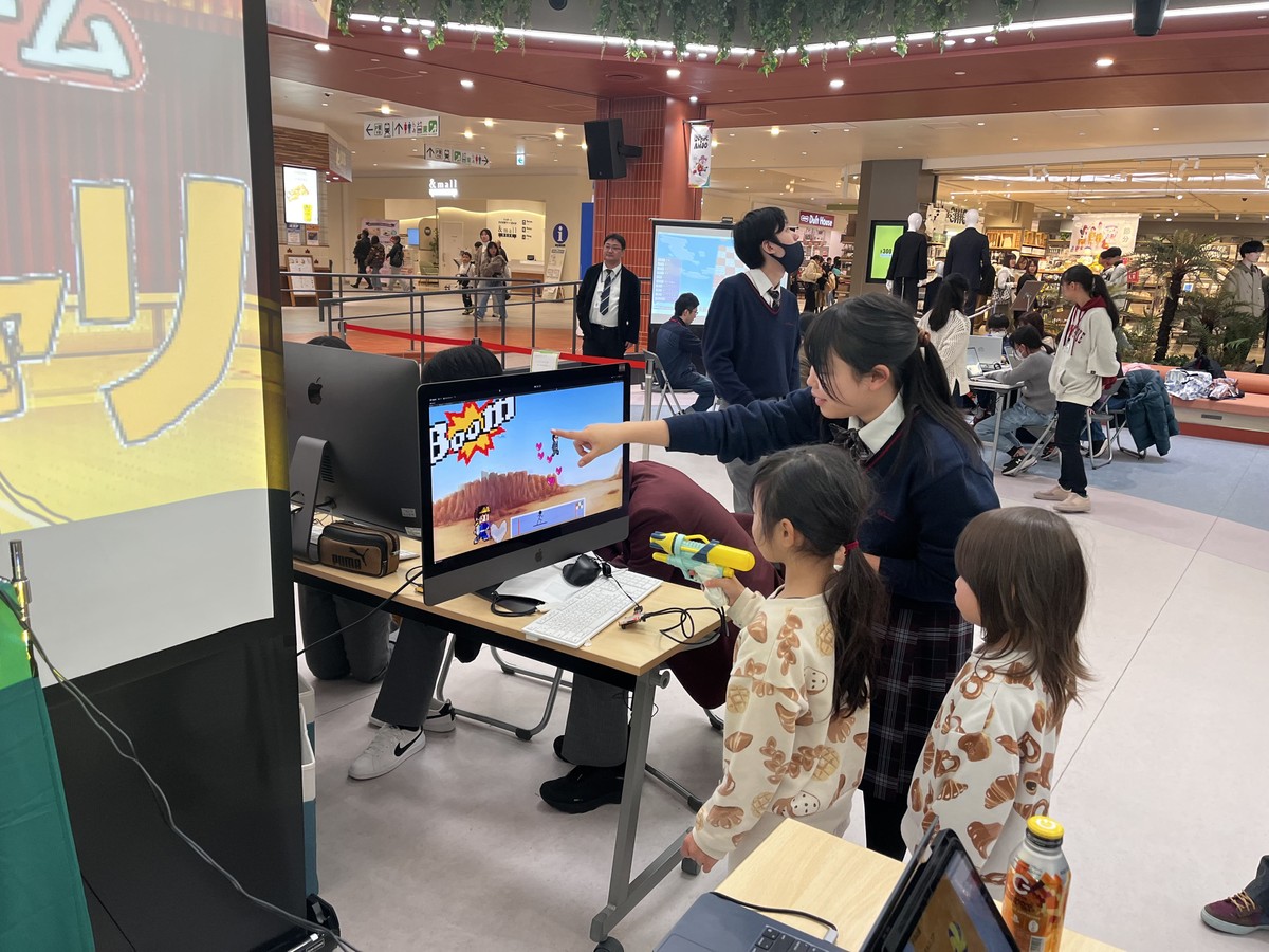 完成したゲームは、12月20日にはイオンモール長久手、年が明けて1月12日にはららポート安城で開催された体験型イベントに出展し、地域の子どもたちや保 護者、買い物客など、幅広い来場者に実際に遊んでもらいました。会場では、高校生自身が制作者としてブースに立ち、来場者への声かけ、ゲームの説明、操作のサポートを行いました。