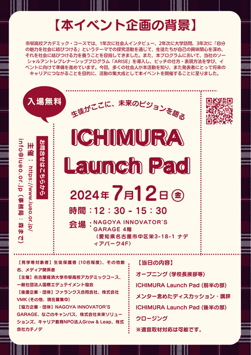 3年Acコースでの活動についてご紹介させていただきます。 7/12に開催される高校生によるピッチコンテスト「ICHIMURA Launch Pad」にむけて生徒が準備を進めています。 イベントのテーマは「私がこの先、そこ … "【生徒3Ac広報チームより】ICHIMURA Launch Pad 開催!" の続きを読む