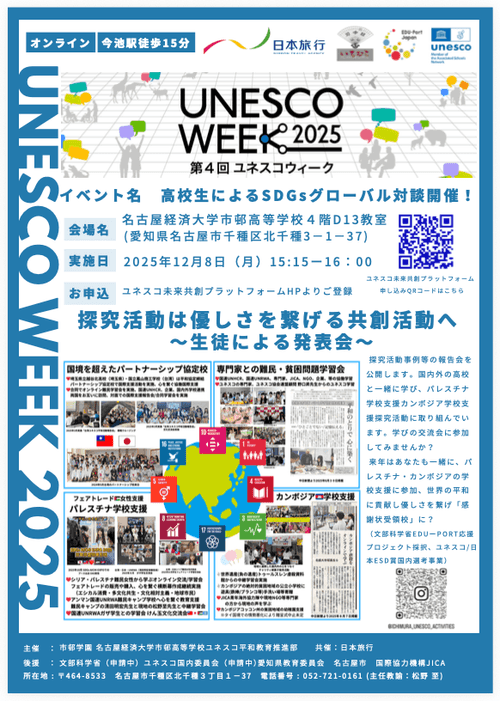 世界では今も、戦争や紛争により、命や暮らし、そして「学ぶ機会」を奪われている人々がいます。そうした現実を前に、私たちは何を知り、どう考え、探究活動に取り組むことができるのか。 市邨高校ユネスコ平和教育推進部(校務分掌)で … "UNESCO WEEK SIDE EVENT 市邨学園主催 高校生によるSDGsグローバル対談」" の続きを読む