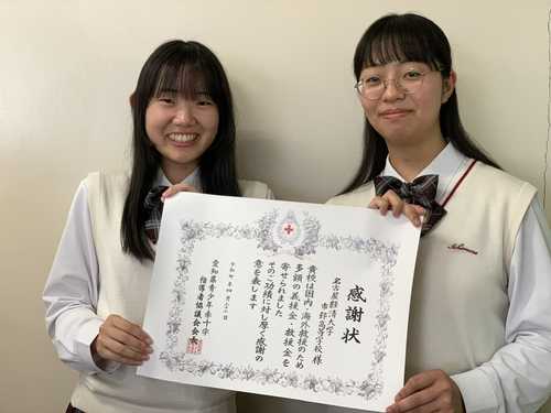 本校のインターアクトクラブへ、日本赤十字社より感謝状が届きました。これまでの継続的な募金活動等で赤十字社に送った能登半島地震への義捐金・救援金に対する感謝状とのことでした。