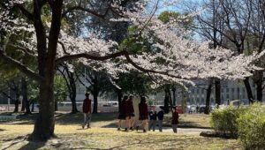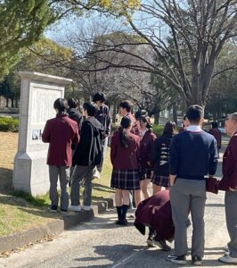 千種公園に3つある石碑の碑文を読んで、なぜここに石碑が立っているのか考えグループで話し合って、 教員に言いに来る活動を行いました。学校周辺も見学し、昔の街道の碑も見に行きました。3月16日の実施した時は、既に桜がきれいに咲いていました。