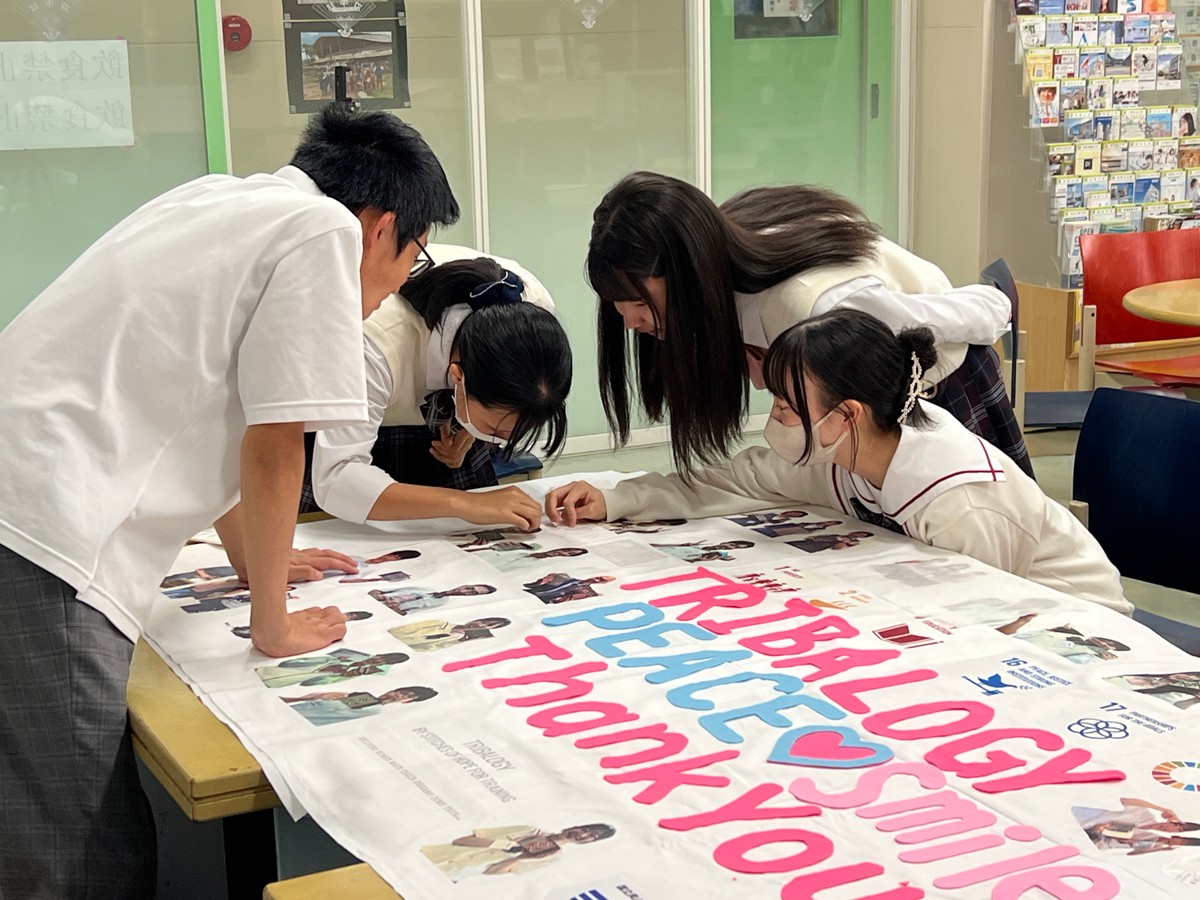 ユネスコパートナー協定校とのファトレード活動国際支援を実施しました。そのメンバーで「PEACE💖SMILE」PROJECT〜難民女性への応援幕〜 を実施しました。
