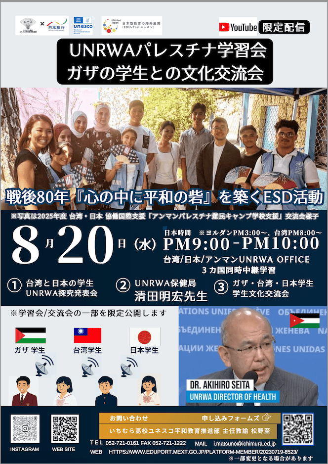 今回、パレスチナ支援に取り組む UNRWA 保健局長の清田明宏氏と、ガザ出身の学生を、アンマンを訪問中の市邨高校教諭松野至が中継接続し学習会と交流会を実施します。