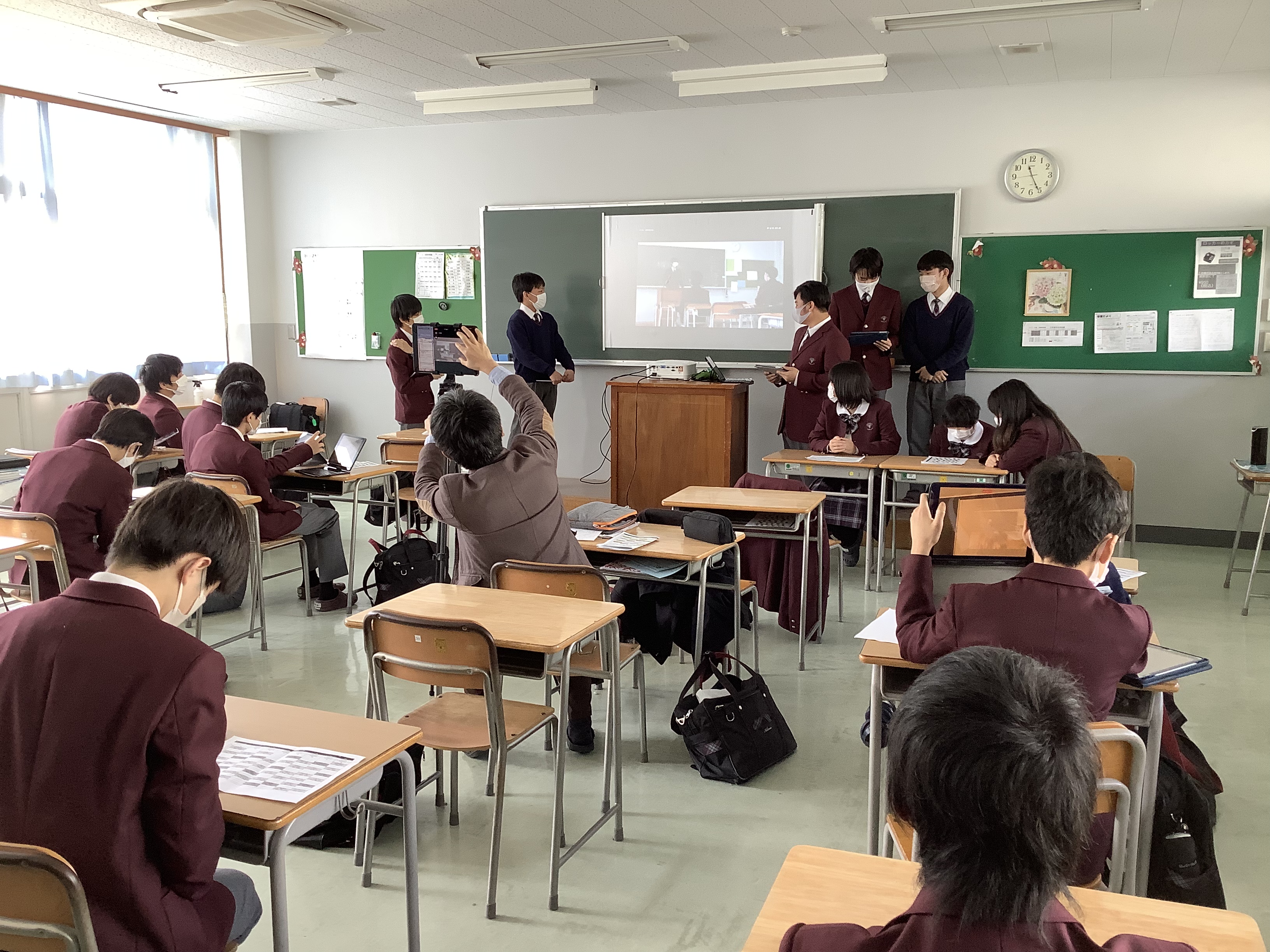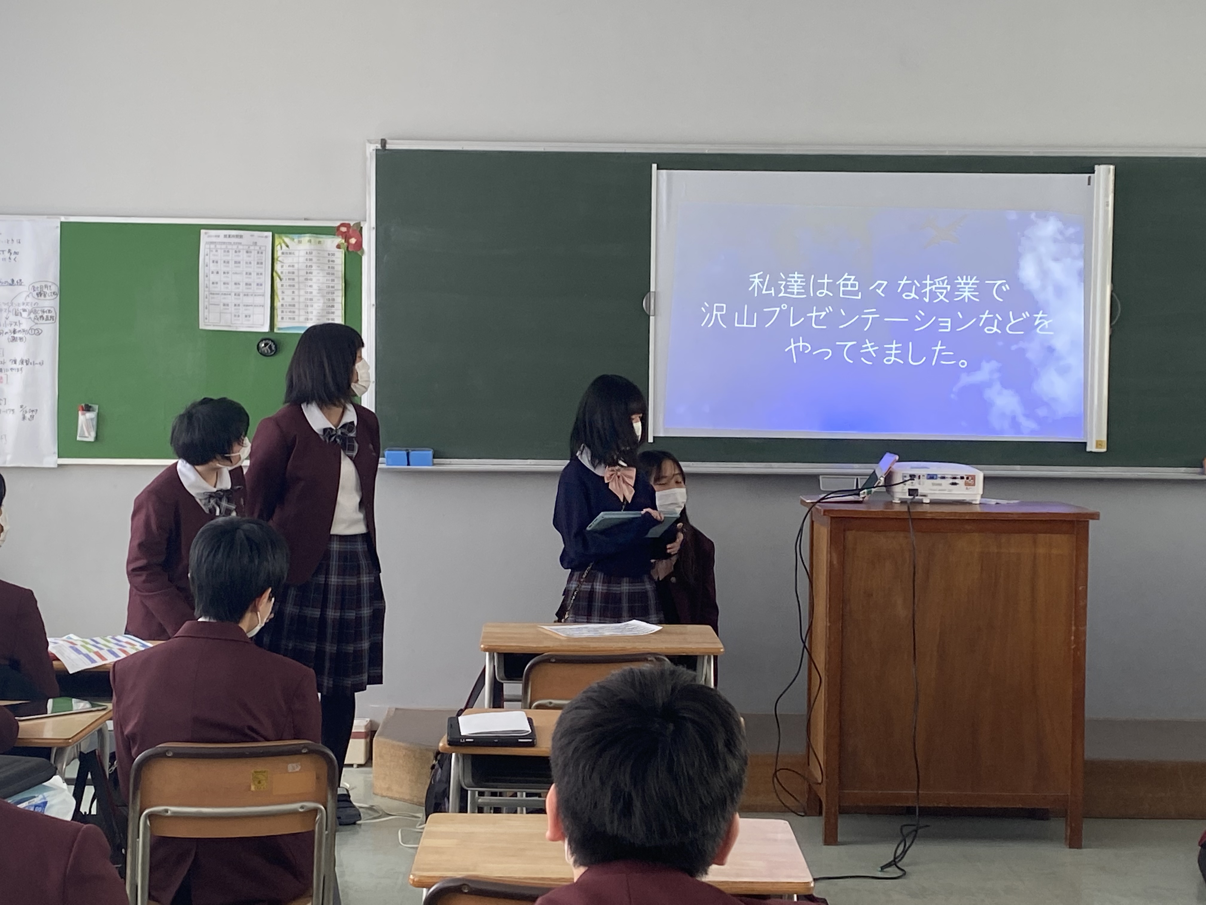 生徒たちはこの1年間を振り返り、「一年間の成長」をテーマにプレゼンを行いました。「マナー」「コミュニケーション」「プレゼンテーション」「iPadの活用方法」「メディアリテラシー」内容は多岐に渡りましたが、どのグループもICTをただ活用するだけではなく、声の大きさや姿勢、質問対応も意識をした素晴らしい発表をすることができました。