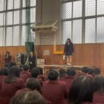 校歌斉唱と校長先生のお話のあと、生徒集会ということで今学期顕著な活躍を したり、この冬の全国大会等に出場する部活動/個人の報告会がありました。