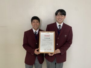 受賞したのは男子5名、テーマは『教育現場をより良いものにするために必要なものは何か』ということで、二学期末にコース全体で実施した「コース別自主活動日」における探究活動で企業訪問を行った際、企業側からいただいた課題をもとにグループで探究活動を行った成果 を発表したものです。