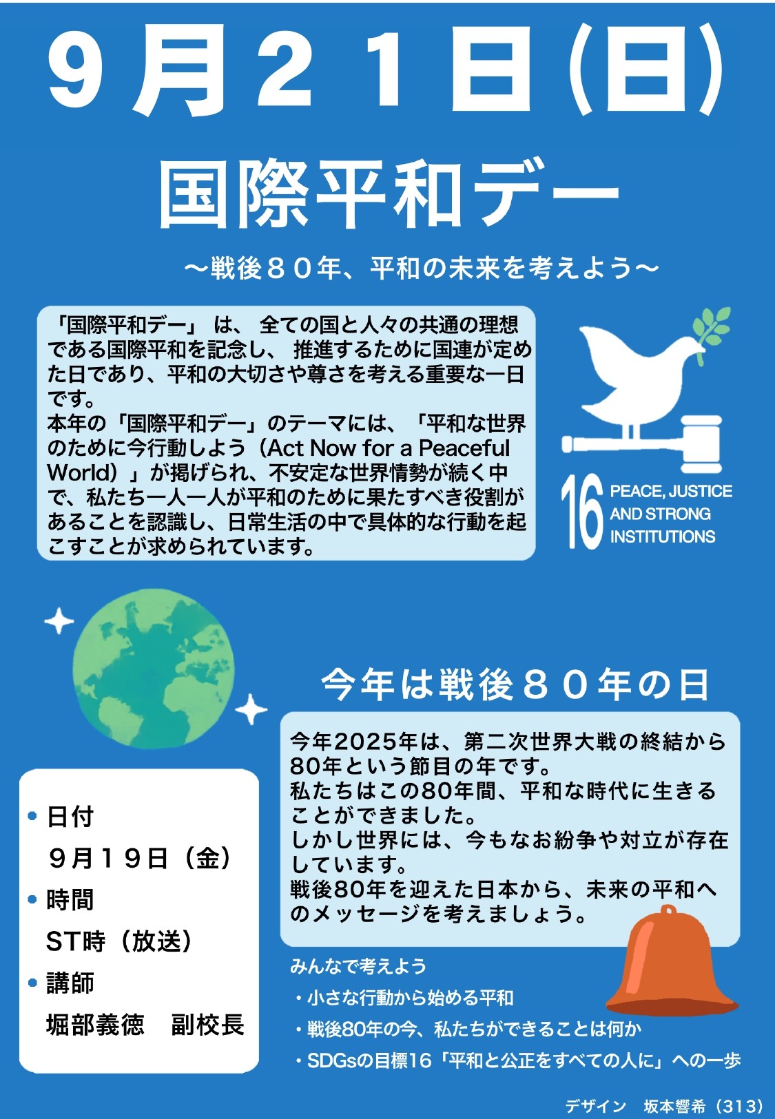 9月19日(金)、朝のST時に「国際平和デーによせて」と題して、堀部副校長先生から全校放送がありました。国連で定められている国際平和デーは9月21日(日)となっていますが、それに先立って全校生徒・職員への国際平和への啓発を行うことを目的に、ユネスコスクール活動の一環として毎年行っているものです。