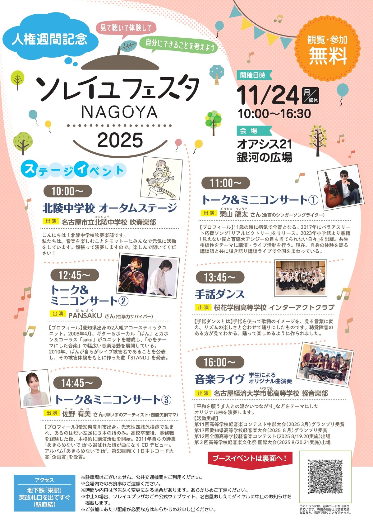 なごや人権啓発センター・ソレイユプラザなごやの主催するこのイベントでは、ステージでのトークイベントや体験ブース、ライブパフォーマンスなどが行われ、数々の大会で受賞経験のある本校の軽音楽部にこのたび白羽の矢が立ちました。