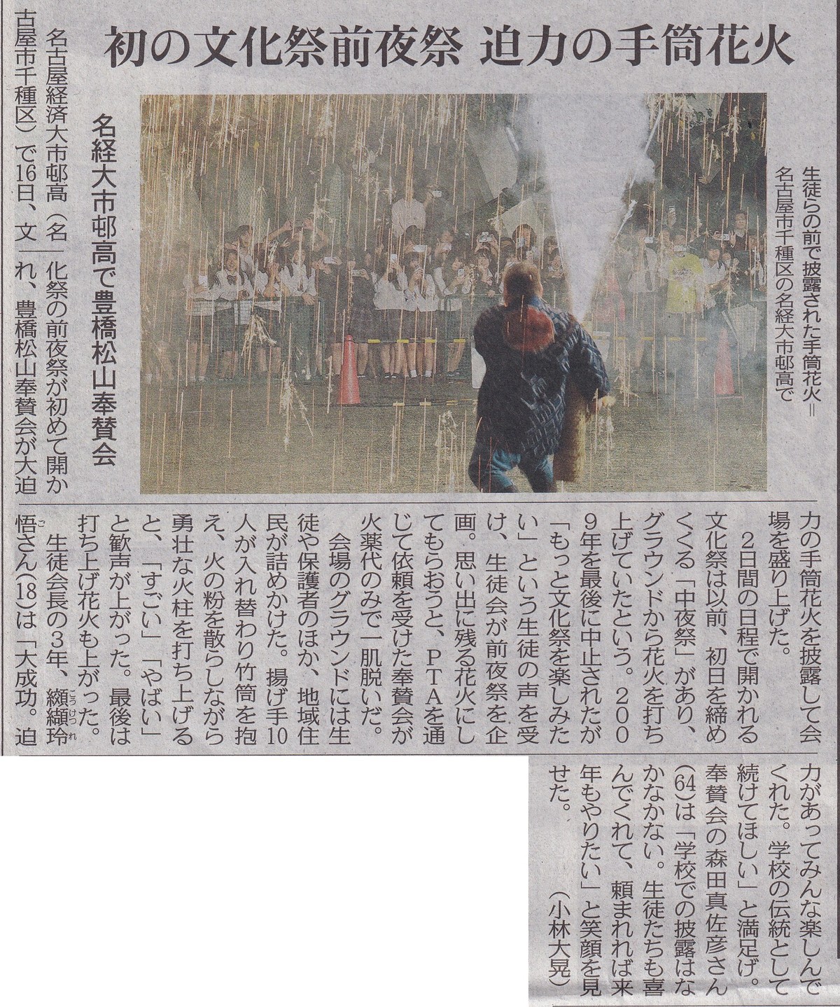 なお、当日の模様は新聞の取材が入り、10月17日(金)の中日新聞・朝刊12面(愛知県民版)に記事掲載されました!さあ、いよいよ翌日から文化祭本番のスタートです。若さと創造力を爆発させてほしいと思います!