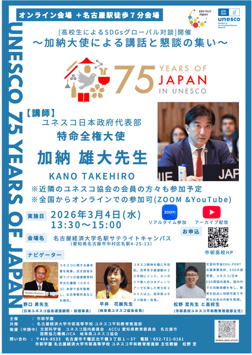 高校生によるSDGsグローバル対談 2026.03.04 加納雄大先生(ユネスコ日本政府代表部・特命全権大使)との懇談会を以下の通り開催します。申込みはつぎのリンク先からお願いします 申込先 https://forms. … "加納雄大先生による講話と懇談のつどい 〜日本ユネスコ加盟75周年記念事業〜" の続きを読む