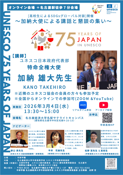 高校生によるSDGsグローバル対談 2026.03.04 <市邨学園からのお知らせ> このたび、市邨学園では、日本のユネスコ加盟75周年を記念し、公開型学習会「高校生によるSDGsグローバル対談 ~加納大使による講話と懇 … "加納雄大先生による講話と懇談のつどい 〜日本ユネスコ加盟75周年記念事業〜" の続きを読む