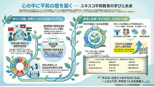 本校では、ユネスコ憲章前文に掲げられた「人の心の中に平和の砦を築く」という理念のもと、対話・協働・国際理解を柱としたユネスコ平和教育・ESD(持続可能な開発のため の教育)を継続的に実践してきました。 生徒たちは、世界で起 … "市邨高校ユネスコ平和教育(ESD)教育事業のご案内" の続きを読む