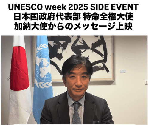 このたび、ユネスコウイーク・サイドイベントにおいて、 国際連合教育科学文化機関(ユネスコ)日本国政府代表部 特命全権大使 加納雄大 大使より、本事業に向けた大変あたたかく、内容の具体性に富んだビデオメッセージをお寄せいた … "ユネスコ日本国政府代表部特命全権 加納雄大大使からのビデオレターを上映" の続きを読む