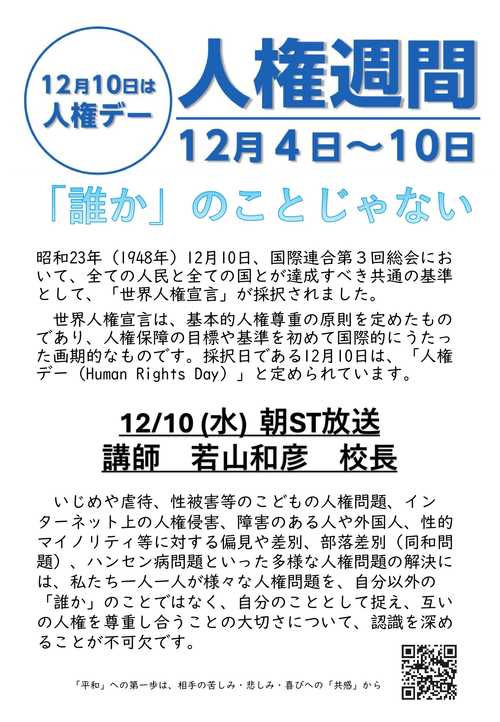 日本では12月4日~10日を「人権週間」とし、国連による世界人権宣言の意義を再認識し、人権尊重の意識を高めるため、この期間各地でさまざまな啓発活動が行われています。本校においてもこの主旨に賛同し、市邨ゼミやユネスコスクー … "世界人権デーに際して" の続きを読む