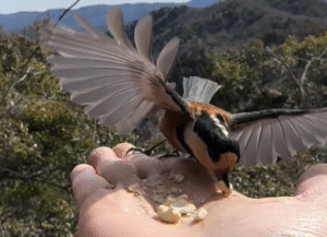 1月の山行は、最長最強寒波後の低山を歩きました。低山は生物基礎で学習した森林構造や地域のバイオーム(この地域は照葉樹林帯)を実際に観察することができます。また、野鳥観察にも適した季節です。今回も木の実を手のひらにのせると野鳥(ヤマガラ)が食べに来てくれました。