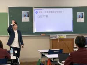 「株式ゼミ」では、株トラカップ運営委員会から大学生講師の方2名が来校し、生徒たちに株トラでの投資シミュレーションを説明。この日、学生による金融教育をNHKが取材に訪れました。ゼミ生もグループディスカッションを行い、意見交換をしていたようです。